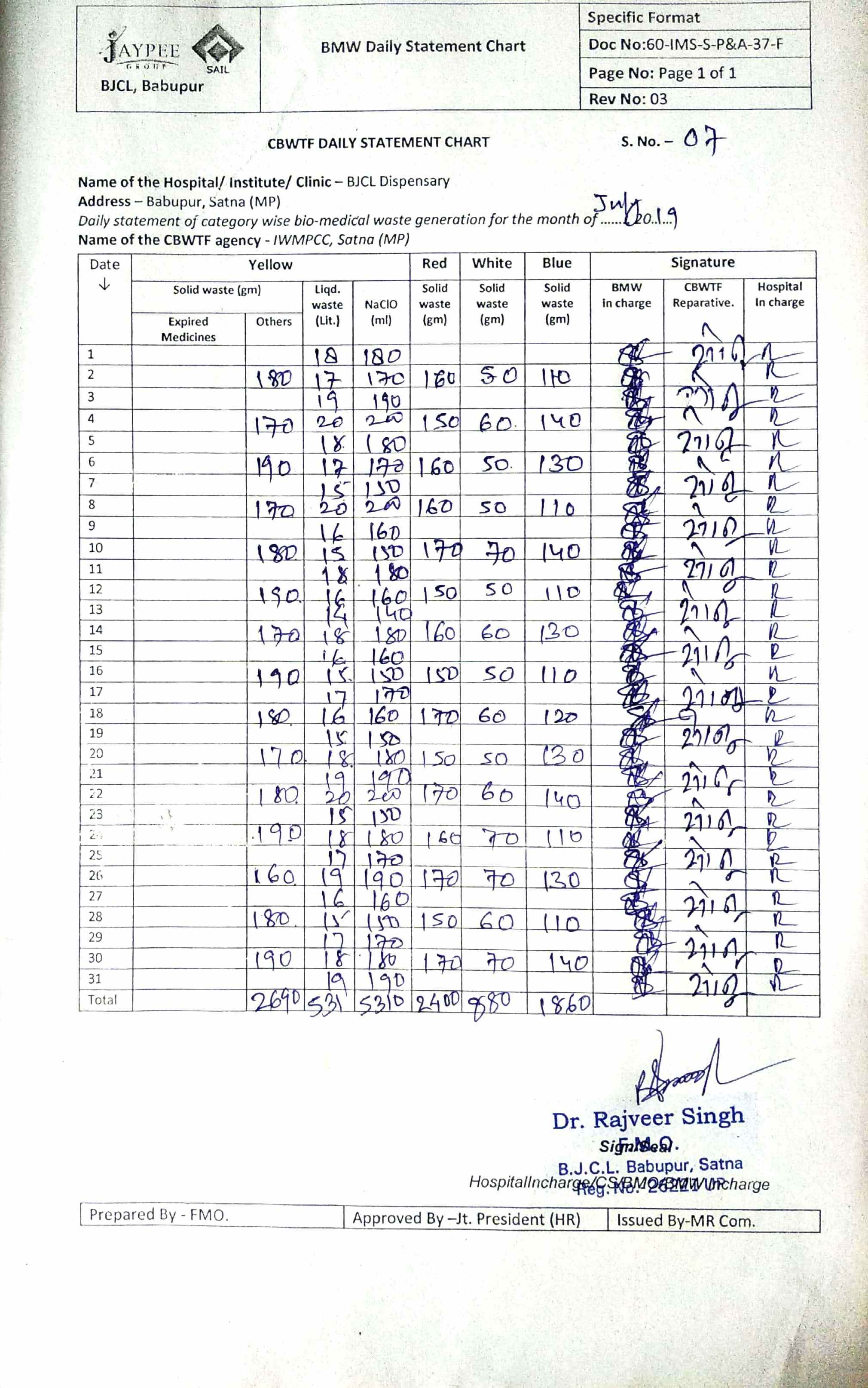 Biomedical Waste July, Aug & Sep 2019 (BJGP, Bhilai) |