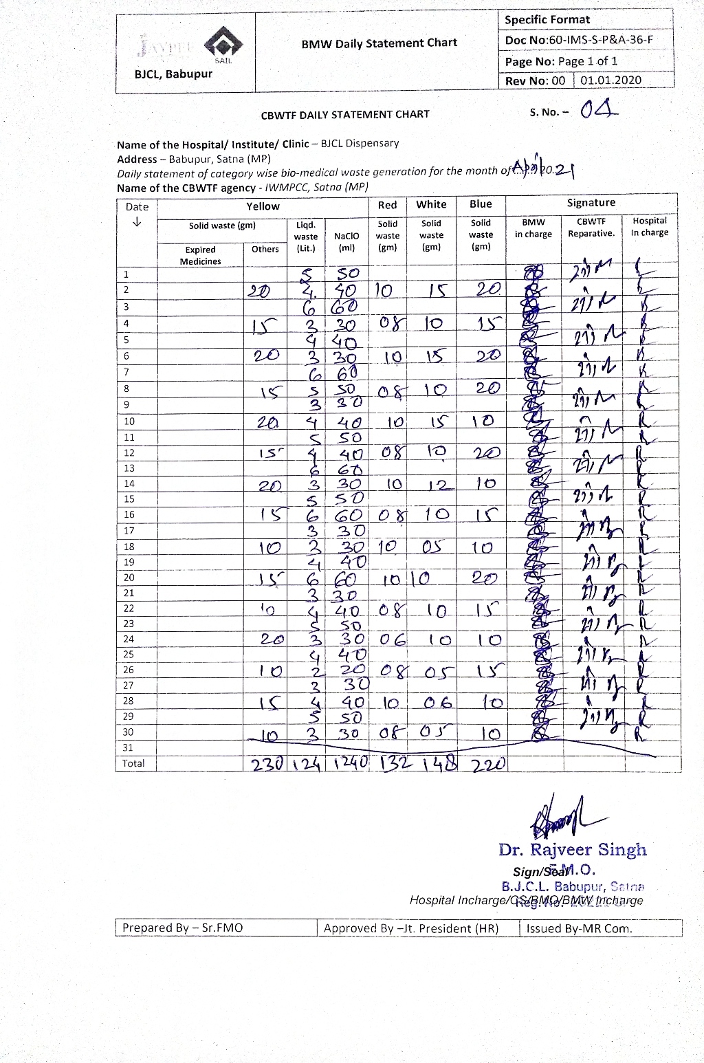 Biomedical Waste Monthly Report, April 2021, (BJGP, Bhilai) |