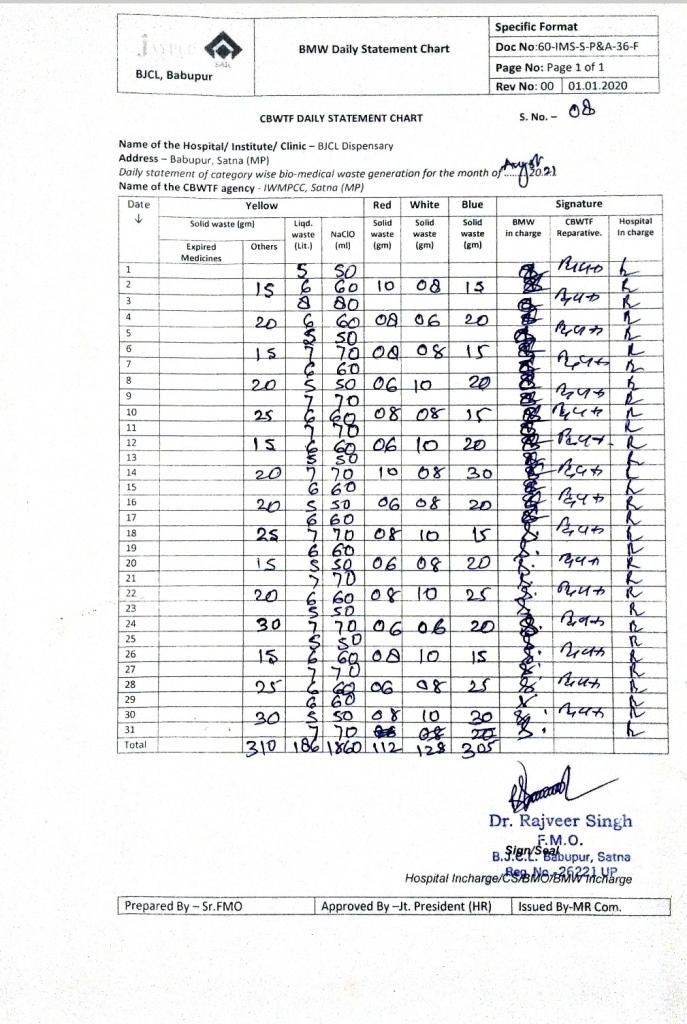 Biomedical Waste Monthly Report, Aug 2021, (BJGP, Bhilai) |