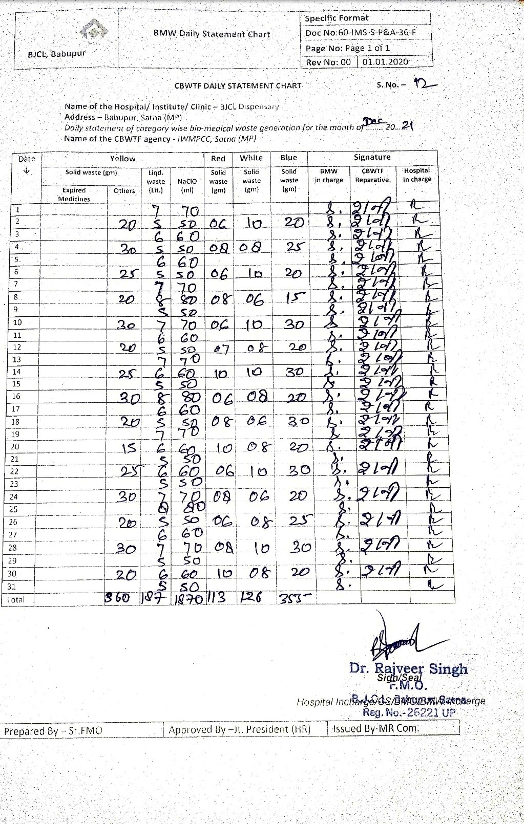 Biomedical Waste Generation & Disposal Report, DECEMBER 2020 (BJGP, Bhilai) |