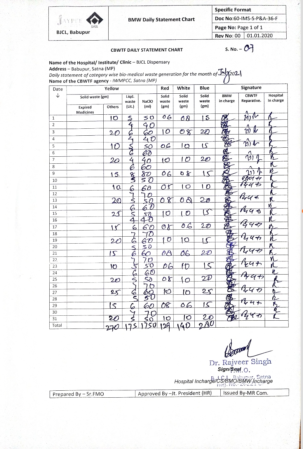 Biomedical Waste Report, July 2020, (BJGP, Bhilai) |