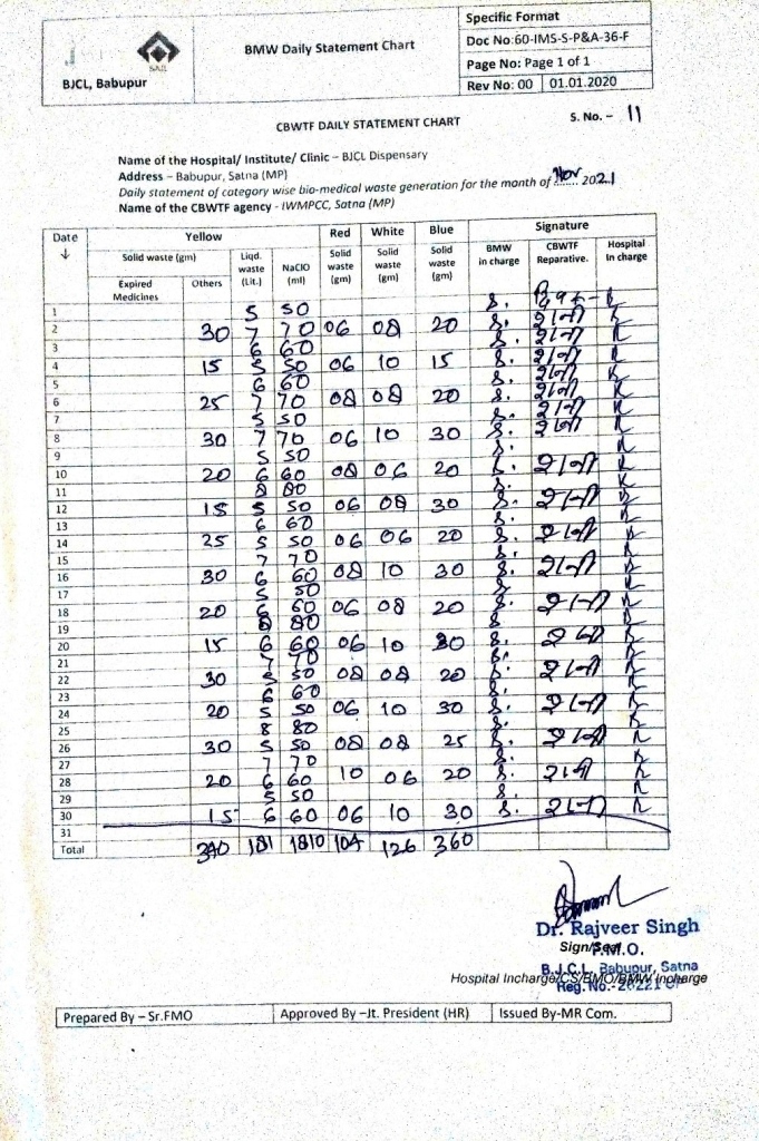 Biomedical Waste Generation & Disposal Report, November 2020 (BJGP, Bhilai) |