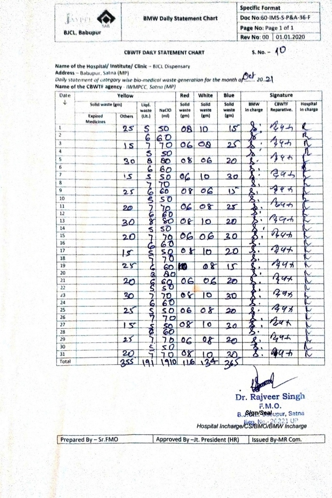 Biomedical Waste Monthly Report, Oct 2021, (BJGP, Bhilai) |