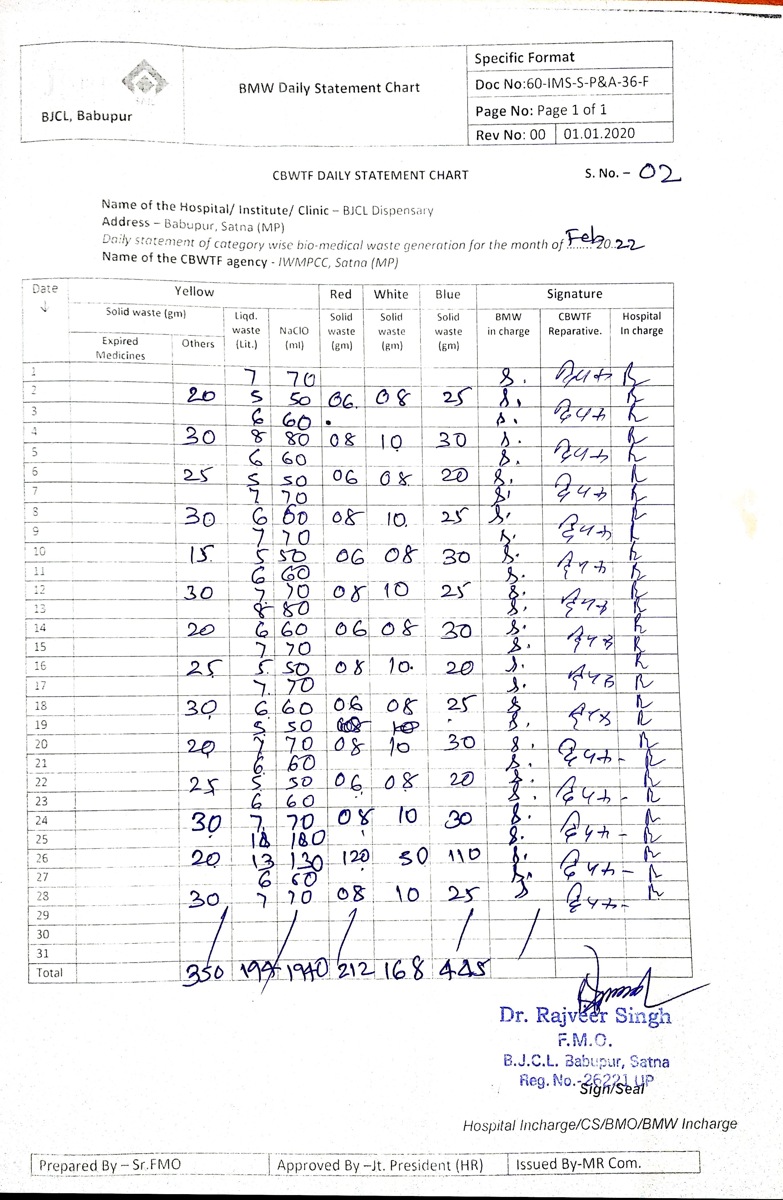 Biomedical Waste Monthly Report, Feb'2022, (BJGP, Bhilai) |